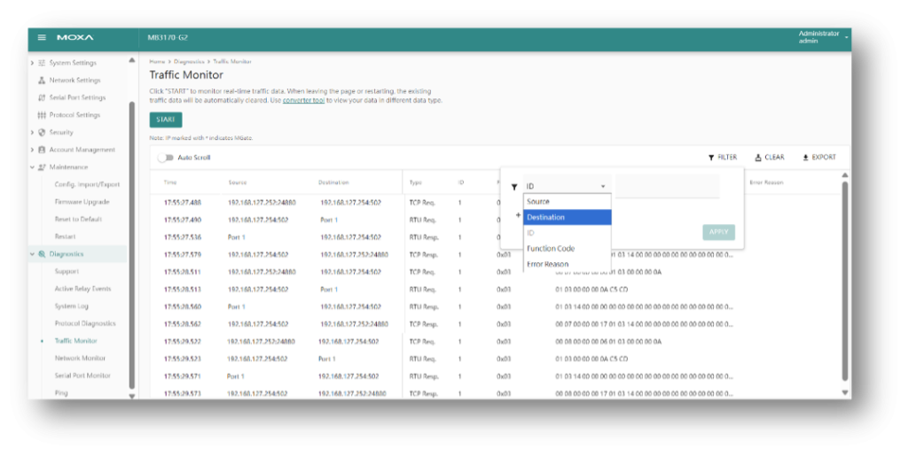 Web arabirimi üzeirnden Protokol analizi yapmak, problem teşhisi yapmak, Modbus Trafiğini monitor etmek mümkün. Artık bu fonksiyonlar için ek bir yazılıma ihtiyaç yok. Modbus sorgulamanın her adımını (örn. ModbusTCP request→ModbuRTU request →ModbusRTU Response→ModbusTCP response ) izleyebilirsiniz.