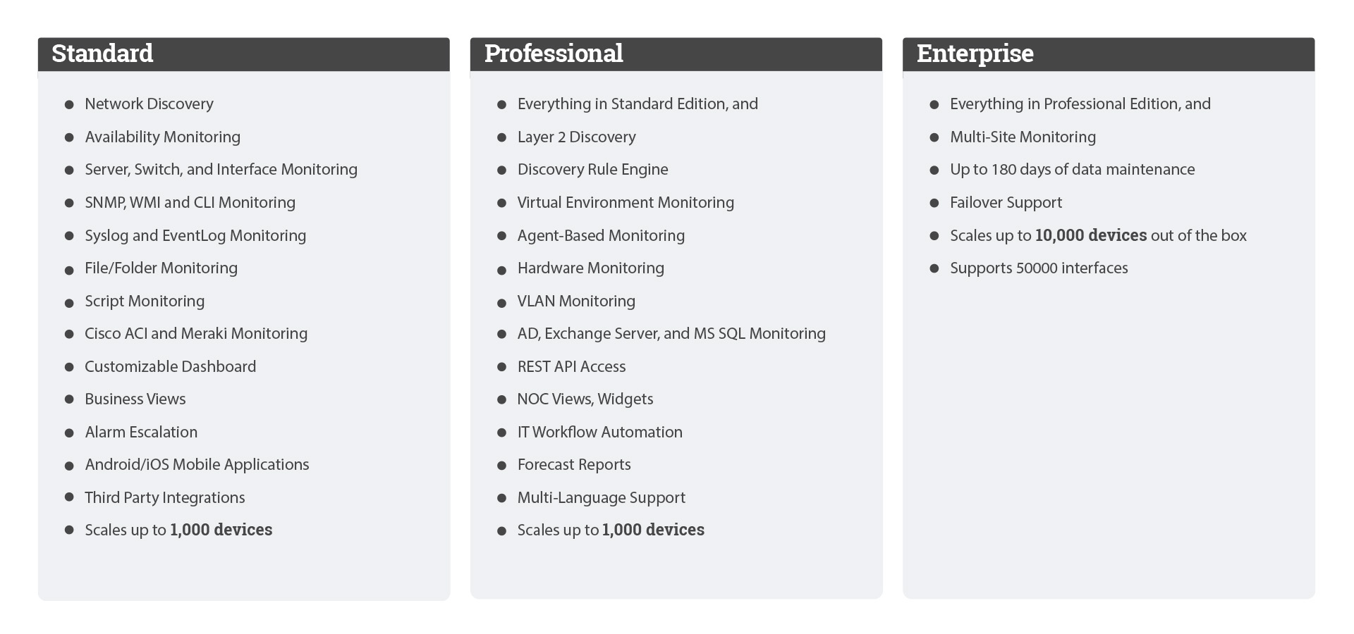 Ağ yapınızı durumunu, performansını ve kullanılabilirliğini izlemek çok önemlidir, ancak bu çözümümüzün sadece bir parçasıdır. Altyapınızı gerçekten güvenli hale getirmek ve optimize etmek için, gelişmiş araçlar ve stratejiler içeren bütünsel bir yaklaşım hayati önem taşır. OpManager’ın kapsamlı eklentileri, ölçeklenebilirlikten ödün vermeden veya maliyetleri artırmadan izleme yeteneklerinizi geliştirir ve iş ihtiyaçlarınızla birlikte büyüyen uçtan uca ağ yönetimi için ideal bir çözüm sunar. Gerçek zamanlı izleme, arıza tespiti ve otomasyon için ideal bir çözümdür ve sistem arıza süresini azaltır, performansı artırır ve yatırım getirisini yükseltir.