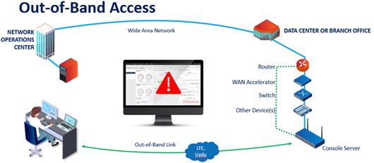 Veri Merkezindeki ağ ünitelerine, Console Server üzerinden erişim bağımsız ( Örneğin, 4G router, Uydu vb ) bir bağlantı üzerinden yapıldığında Out of Band bağlantıyı ifade eder.